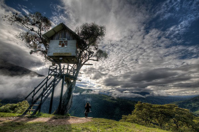 خانه درختی که در تصویر مشاهده میکنید در واقع یک ایستگاه لرزه نگاری است، خانهای کوچک که روی درخت و درست در لبه یک دره عمیق ساخته شده است. از این نقطه میتوان دیدی عالی به منطقه کوردیلرا (Cordillera) و همین طور آتشفشان فعال تانگوراهوا (Tungurahua) داشت. اما برای عاشقان آدرنالین این نقطه بهشتی به یاد ماندنی است. دوستداران ورزش پیادهروی که به سمت چشم اندازهای زیبا یا همان بلاویستا (Bellavista) حرکت میکنند در طول مسیر سری هم به این نقطه میزنند تا برای لحظاتی به سوی ابدیت تاب سواری کنند. این تجربه مخصوصا زمانی که ابرها محیط اطرافتان را احاطه کردهاند جالبتر میشود.